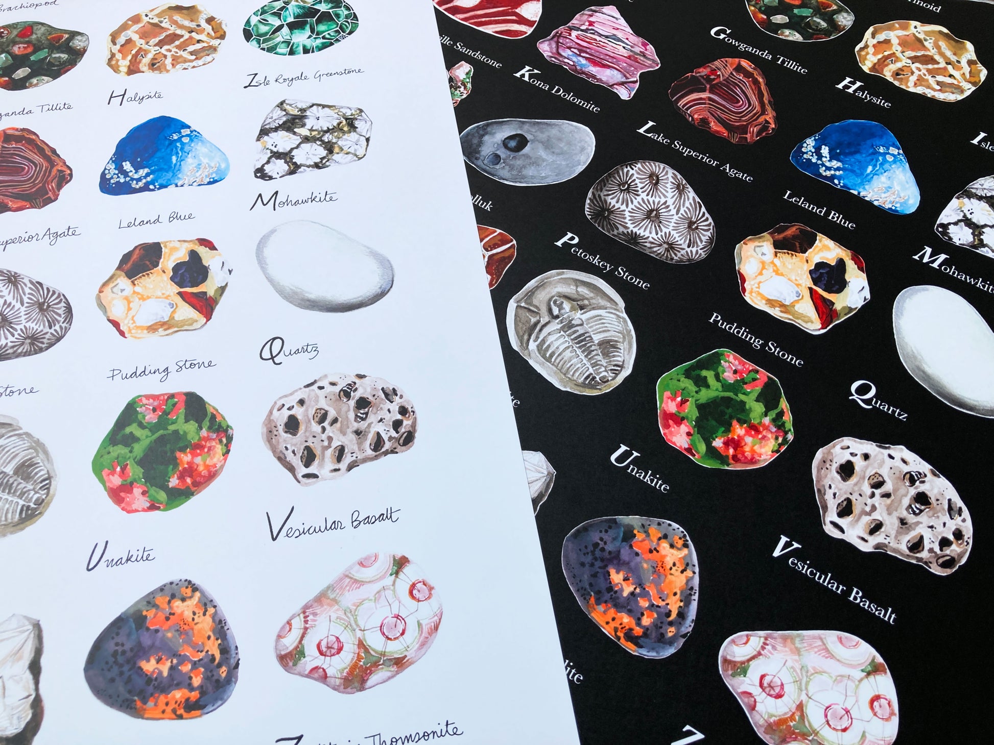 I've fallen in love with Michigan fossils and stones, and have connected with many people over our shared affection for them. I've created this piece to celebrate Michigan's beautiful rocks and minerals with you. They are treasures held within Michigan's earth and jewels that decorate its lakeshores.