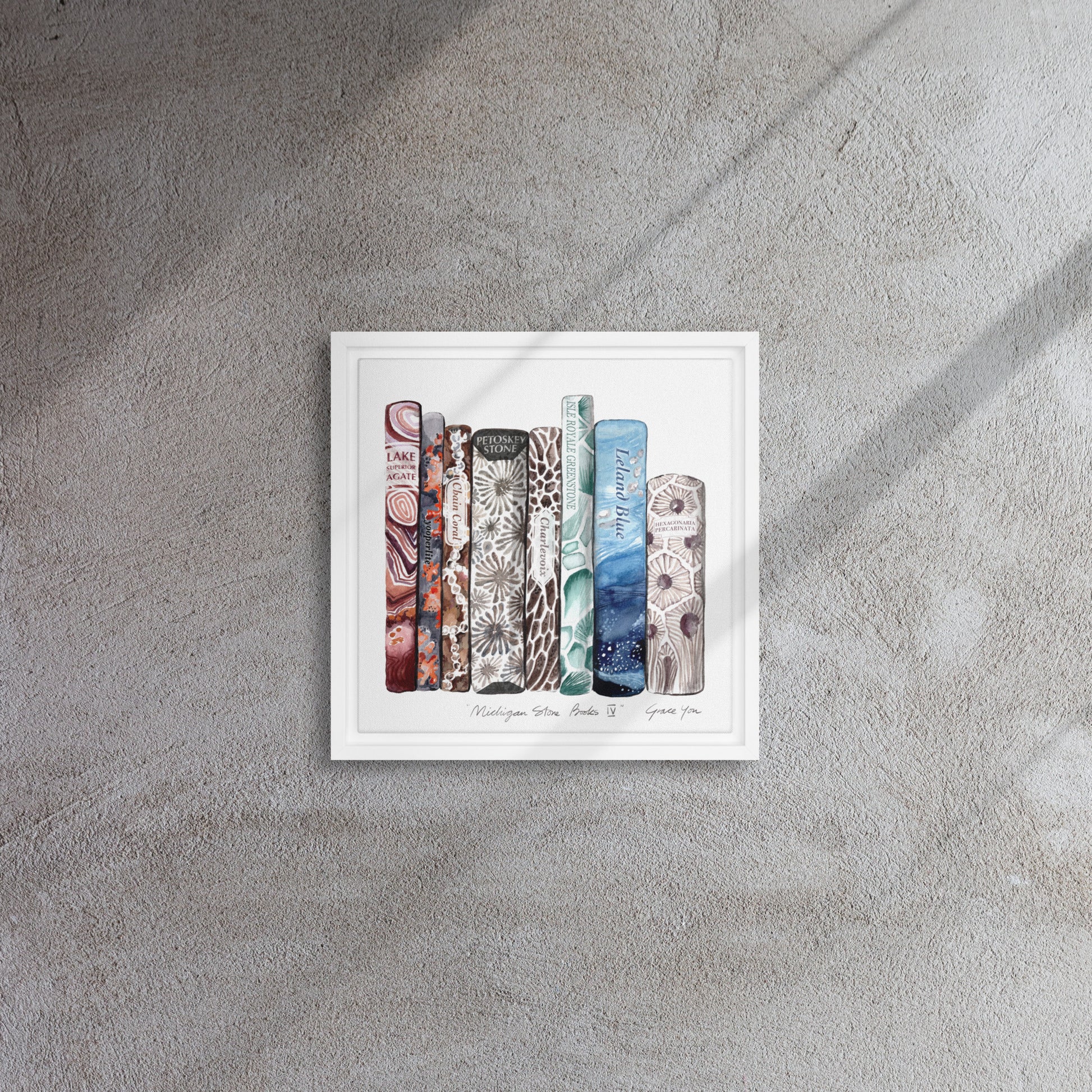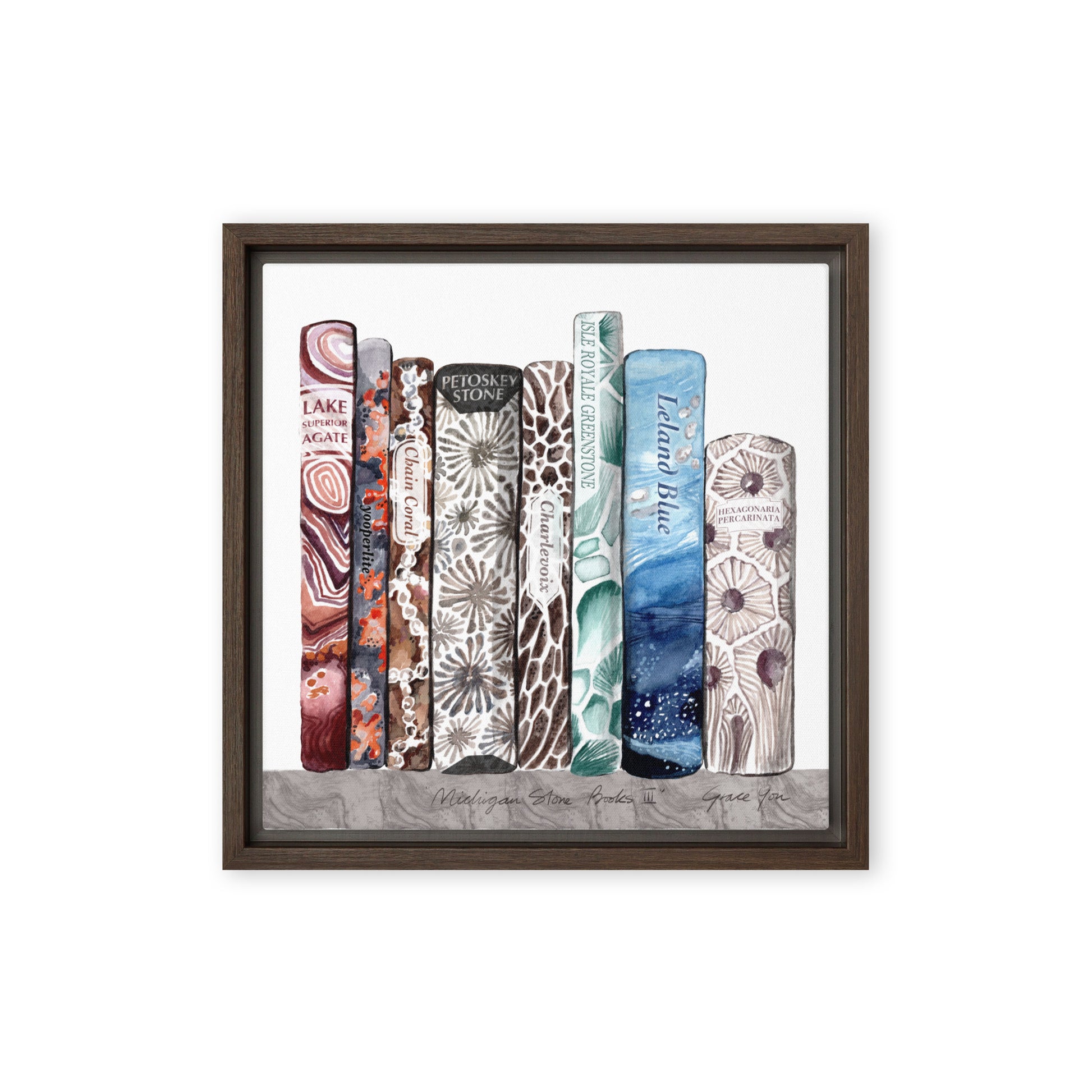 These books are adorned with the beauty of Michigan stones. Each book spine features a stone's signature pattern along with its name. I imagine them to embody energy from and stories of the Great Lakes. It is both filled and blank, ready to meet your eyes and have your imagination fill its pages.