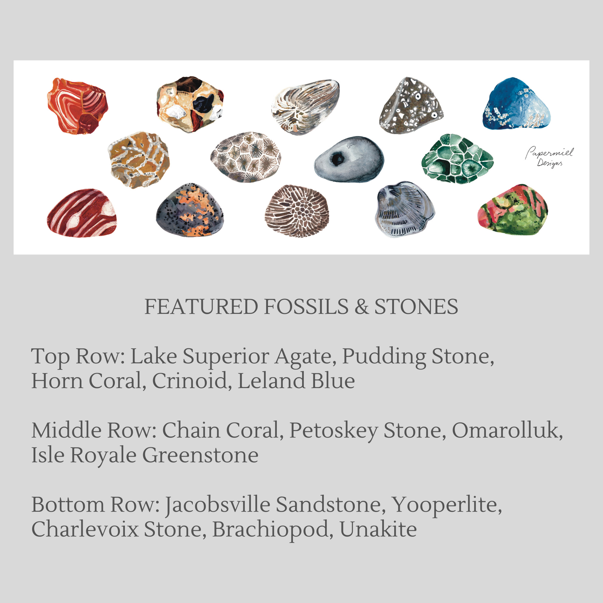 Featured fossils and stones: Lake Superior Agate, Pudding Stone, Horn Coral, Crinoid, Leland Blue, Chain Coral, Pestosky Stone, Omarolluk, Isle Royale Greenstone, Jacobsville Sandstone, Yooperlite, Charlevoix Stone, Brachiopod, Unakite